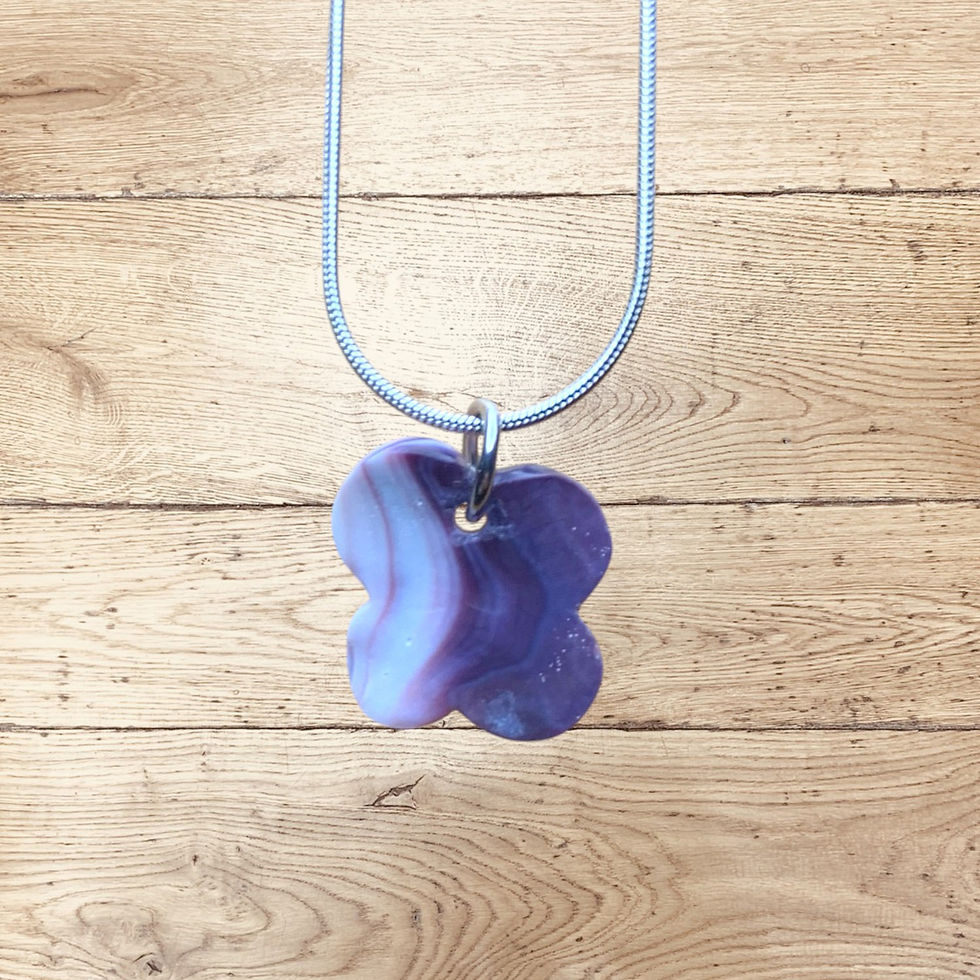 Each piece is hand carved from the quahog shell using a rotary tool with a diamond dip and then put into a rock tumbler for three weeks. The purple is the natural color of the quahog shell. The quahog shells are found on the beaches of Cape Cod. Each half of the quahog shell is a mirror image of itself which is used for earrings. Every pendant is unique because no two shells have the same markings on them.